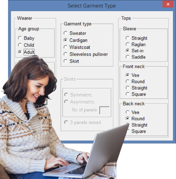 Knitwear design programs can be fun! Select from a range of standard garments, apply standard size tables or your own measurements, and adjust the styling features. Garments designed in this way can be knitted as they are, or used as a starting point for your own original design in Original Pattern Drafting.